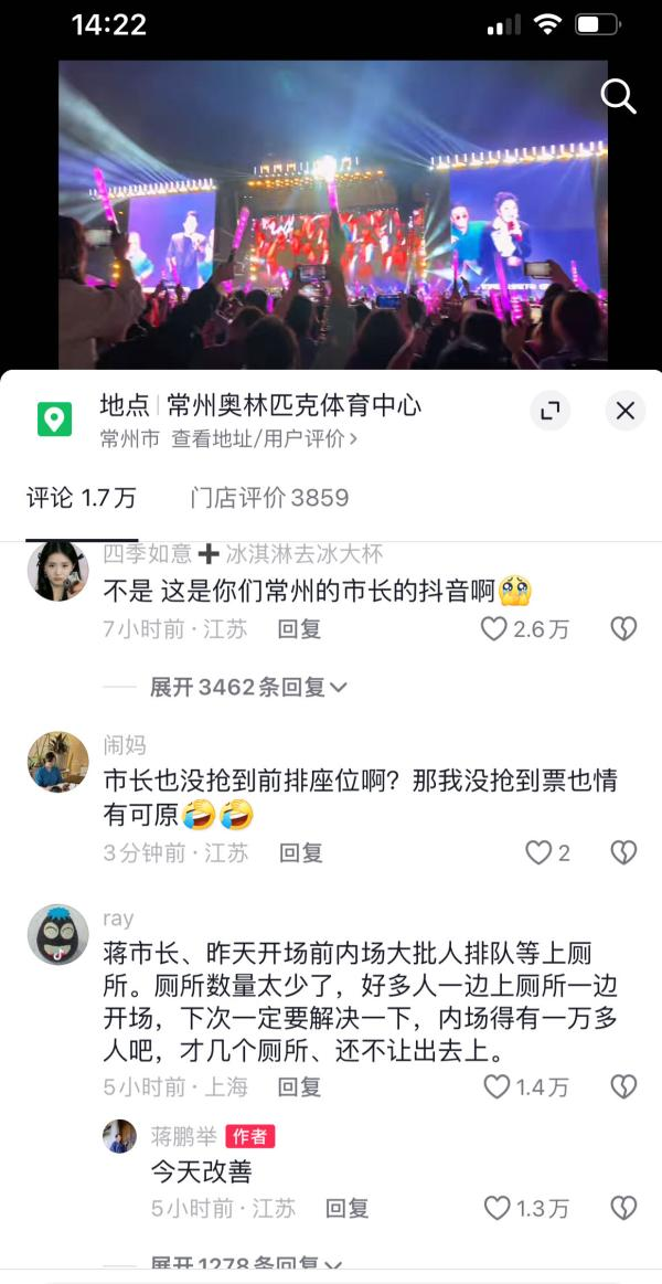 常州市副市长蒋鹏举观看了第一场演唱会并在个人抖音号发了现场视频。有网友就在这条视频下面抱怨内场厕所数量太少。
