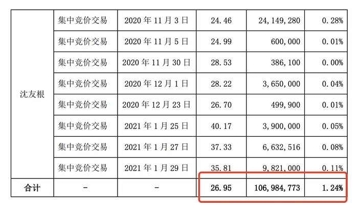这并非沈友根首次减持东方财富股份。早在2020年7月至2021年1月期间,沈友根曾以26.95元的均价在二级市场通过集中竞价方式减持了1.07亿股,约占当时东方财富总股本的1.24%,套现28.83亿元。