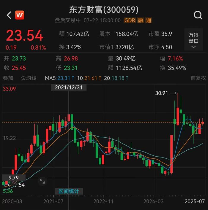 拉长时间线来看,彼时,东方财富股价触达高点也恰是在2021年年末。