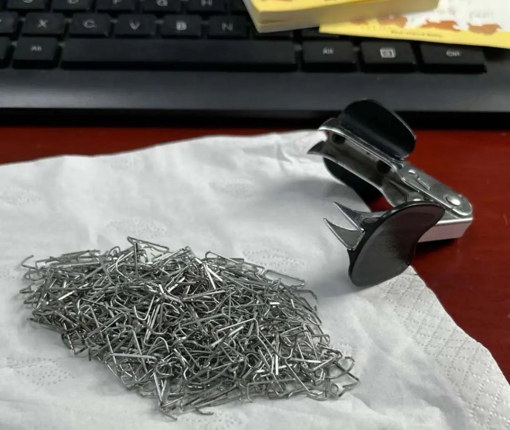 攥住起钉器的握柄,刀口贴着金属钉帽根部 " 咔 " 地楔入纸缝,手腕向上一顶,一颗钉针就从纸张里弹了出来。一个下午里,卢亚齐戴着耳机,手头不停歇地重复这套动作。拆过上百份文书的钉子后,她甚至不用低头看,就能凭手感找准位置。