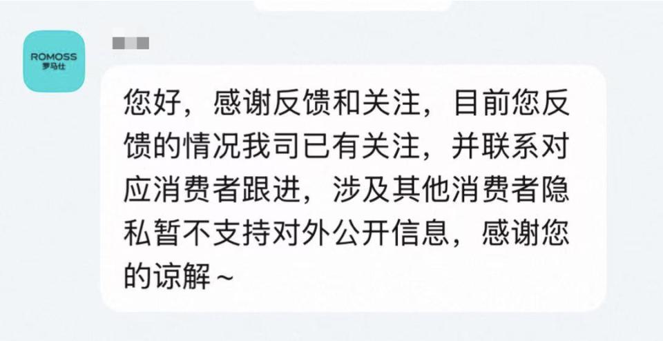 23 日,扬子晚报 / 紫牛新闻记者多次致电罗马仕官网客服电话,均未接通。随后,记者又通过袁女士朋友购买该款充电宝的购物平台联系罗马仕旗舰店客服人员。客服表示,公司目前已关注此事,正核查相关情况并联系对应消费者跟进处理。因涉及消费者隐私,暂无法对外公开其他相关信息。