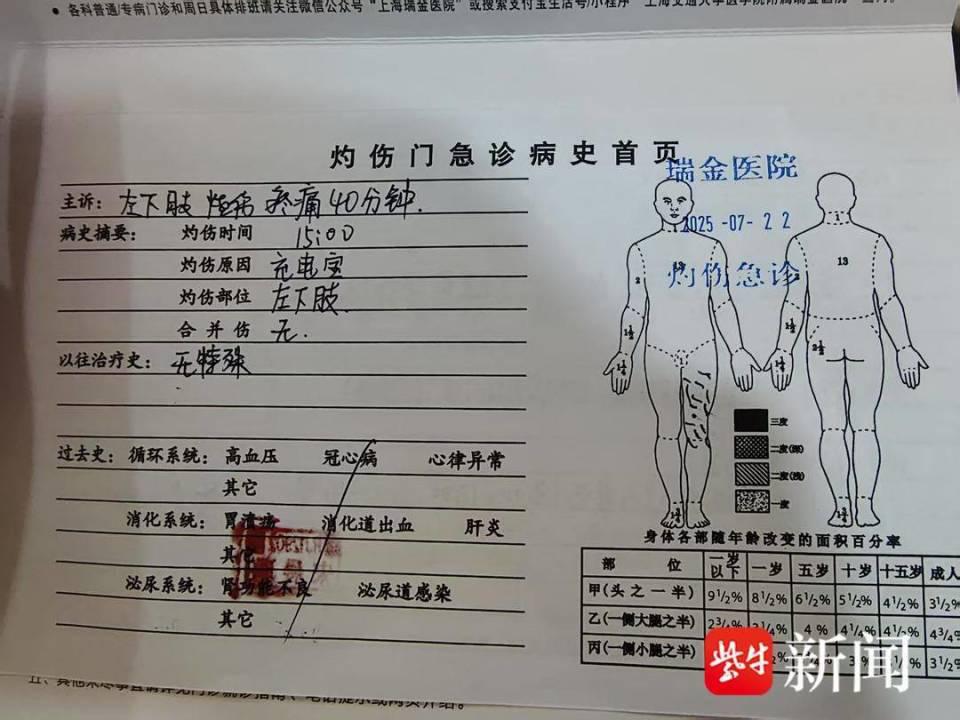 事发后,袁女士立即陪同朋友前往上海瑞金医院灼伤急诊就诊。" 医生诊断为三度烧伤,需要从右腿取皮进行植皮手术,费用大概 3-4 万元,手术安排在 24 日进行。具体的烧伤情况会在术后出院时详细说明。" 袁女士提供的上海瑞金医院烧伤急诊病历上显示,患者主诉左下肢烧伤疼痛 40 分钟,灼伤原因记录为 " 充电宝 "。