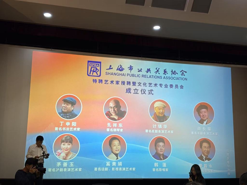 7月24日,“上海市公共关系协会特聘艺术家”授聘暨文化艺术专业委员会成立仪式,在静安区文化馆静·剧场8K映空间举行。8位在全国范围享有声誉的上海艺术大家,成为协会“特聘艺术家”,他们分别是书法家丁申阳、钢琴家孔祥东、昆曲表演艺术家计镇华、京剧表演艺术家尚长荣、沪剧表演艺术家茅善玉、电影表演艺术家奚美娟、歌唱家韩蓬、歌唱家廖昌永(以姓氏笔画为序)。
