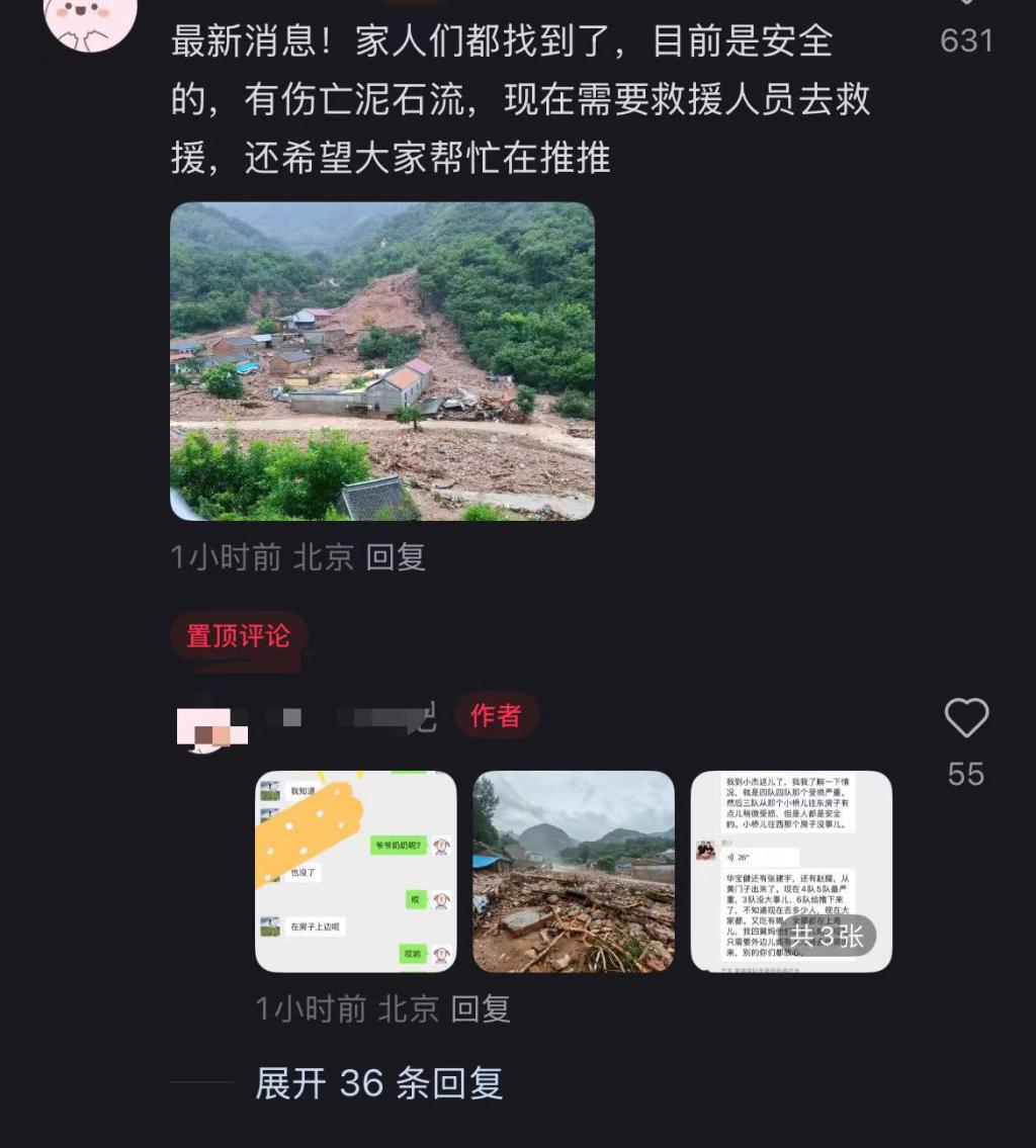 记者注意到,发帖网友后续在评论区更新信息,表示家人已找到,但道路中断,村民急需转移,希望能够有救援队伍进入援助。与此同时,网络平台有人发布信息,留下联系方式请求无人机支援。记者多次尝试拨打该电话,均未能接通。