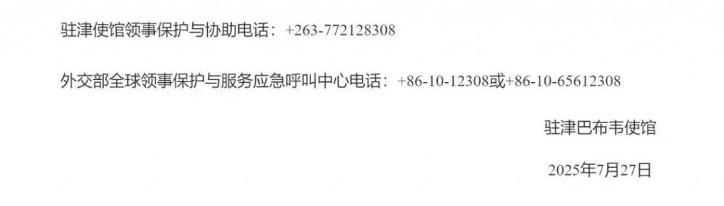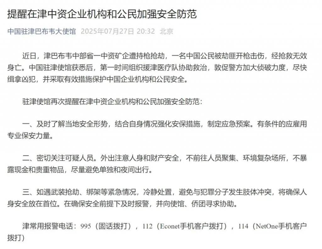 此前,7 月 27 日晚,中国驻津巴布韦大使馆发布提醒: