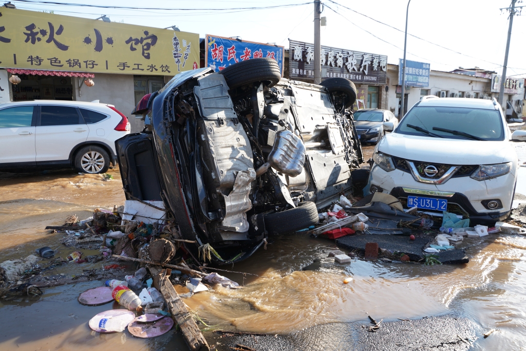 7月29日下午,澎湃新闻记者在太师屯镇走访发现,紧邻清水河下游河畔的永安小区,周边道路积水仍未褪去。沿途随处可见河水漫涌“裹挟”而来的断木、淤泥。有的房屋栅栏、围墙被直接推倒,汽车则像被打乱的积木般摞了好几层。