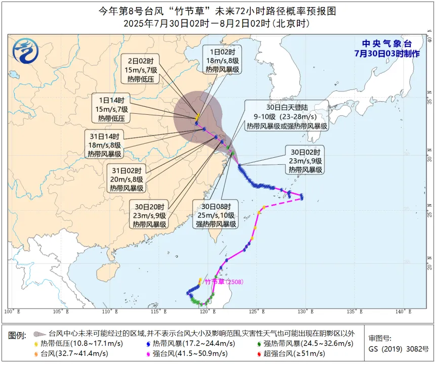 中央气象台发布消息:今年第8号台风“竹节草”(热带风暴级)今天(30日)04时30分在浙江舟山朱家尖岛登陆,登陆时中心附近最大风力9级(23米/秒,热带风暴级),中心最低气压为975百帕。