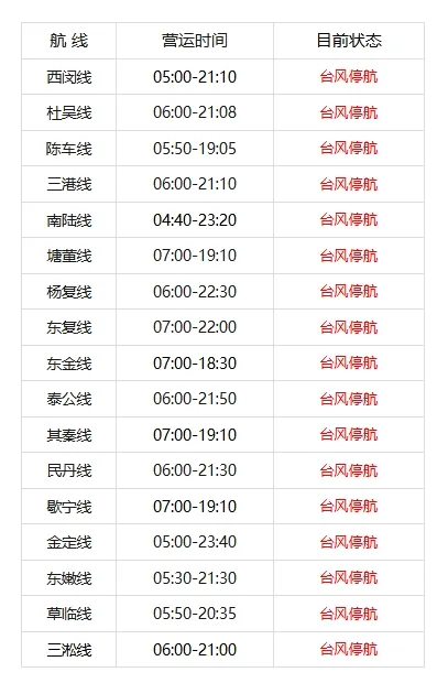 据上海市轮渡有限公司消息,因受今年第8号台风“竹节草”影响,目前轮渡全线停航,请乘客们关注微信公众号的即时信息(营运信息板块-即时消息)了解各航线实时信息。