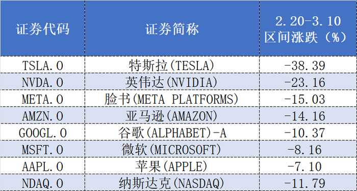 然而,近期以来美股持续走弱,科技股更是成为了“重灾区”,wind数据显示,自2月20日至3月10日纳斯达克指数区间跌幅高达11.79%,美股科技“七姐妹”同期股价也均有不同程度的下跌,其中英伟达股价区间跌幅为23.16%。