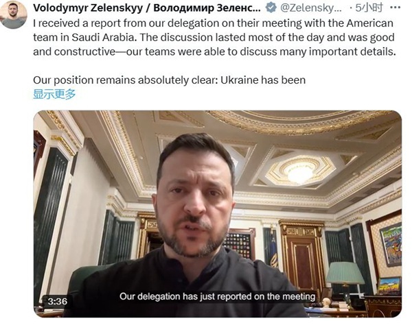 乌克兰总统弗拉基米尔·泽连斯基周二在社交媒体发长文,称乌美的会谈“良好且有建设性”。他表示,在与美方的会谈中,乌克兰提出了3个重点:空中静默——停止导弹、炸弹和远程无人机袭击;海上静默;采取措施建立互信,包括释放军方和平民俘虏。