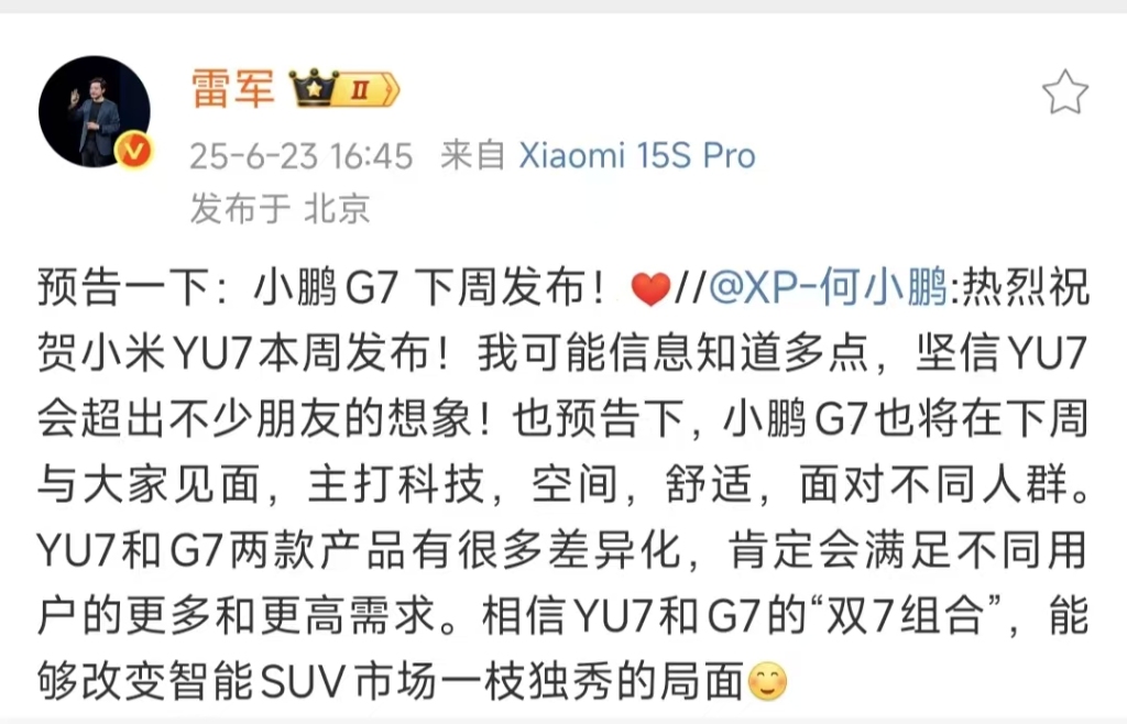 小米YU7明天发布,“蔚小理”齐送祝福,雷军称“比SU7信心更足”资讯