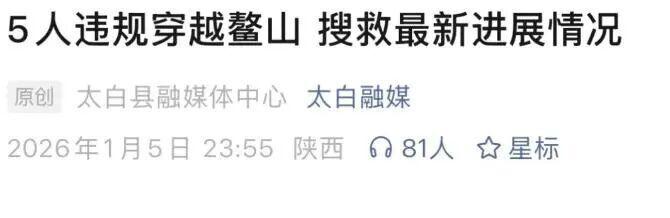 1月5日晚,陕西宝鸡太白县融媒体中心发布《5人违规穿越鳌山搜救最新进展情况》:1月2日凌晨2时左右,...