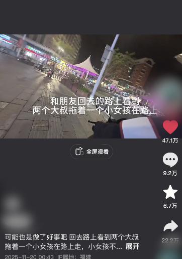 11月20日,福建泉州,一网友发布视频,在街头他遇到了两名中年男子,在人行道上拖行一名年轻女性。这名...