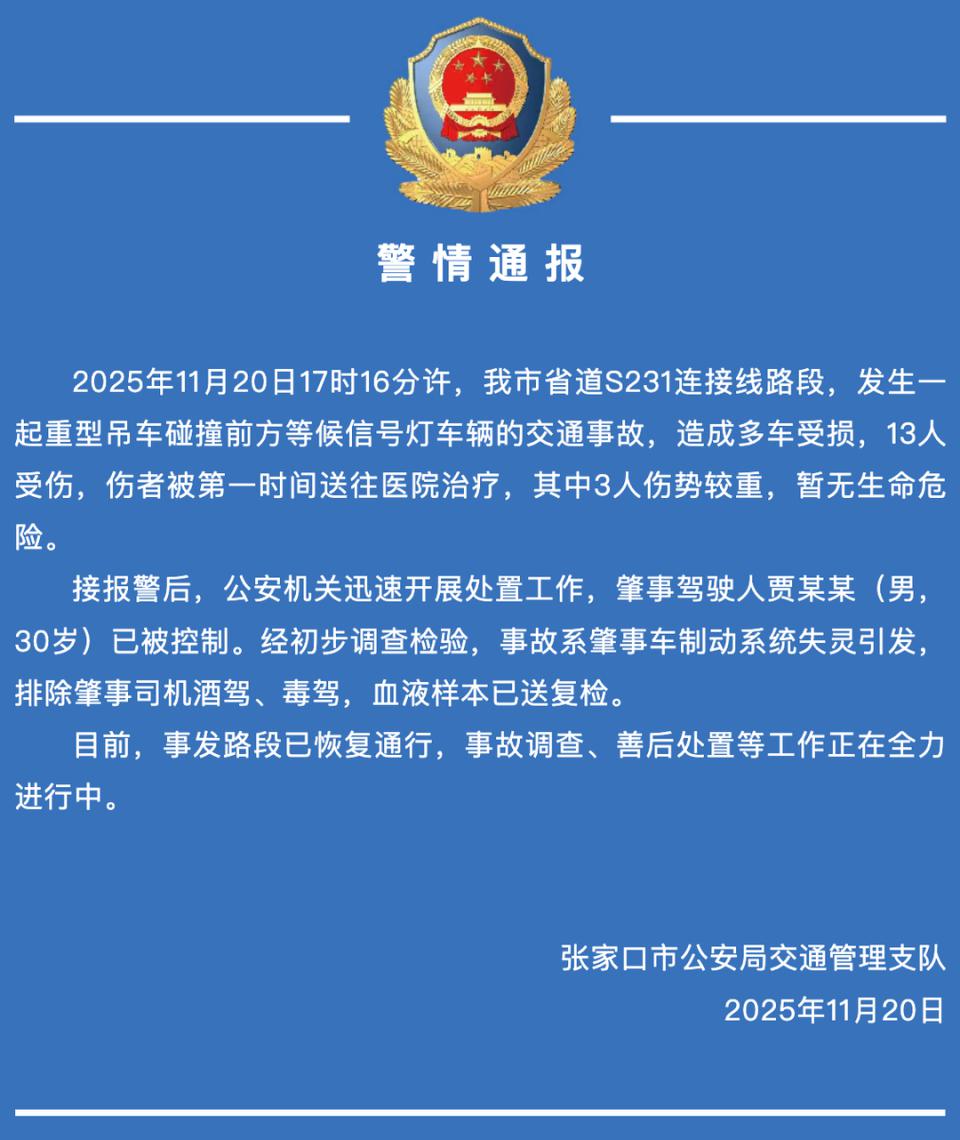 张家口警方通报:重型吊车制动系统失灵碰撞等信号灯车辆,致多车受损13人受伤资讯