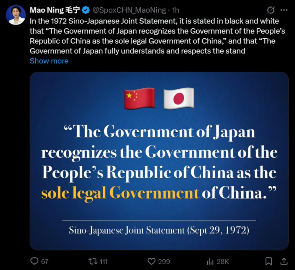 11月16日,中国外交部发言人毛宁在社交平台X上援引1972年《中日联合声明》中涉台内容,用英语、日...