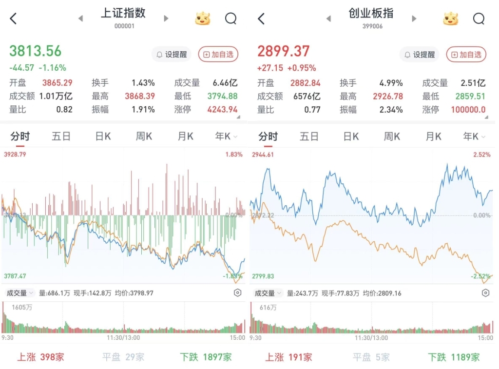 沪指跌1.16%,创指涨0.95%:AI硬件午后再度走强,两市成交超2.3万亿元
