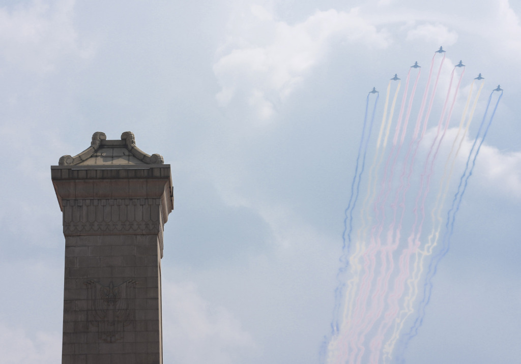 7架战机在空中划出14道彩烟,寓意着中华民族14年可歌可泣的抗战历程,象征着14亿多中国人民奔向强国复兴的光明前景。