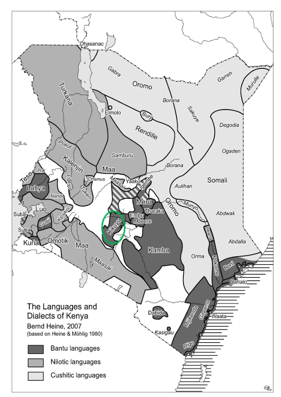 肯尼亚语言地图,吉库尤语(Kikuyu,绿色圆圈标出的地方)属于班图语(Bantu Languages)