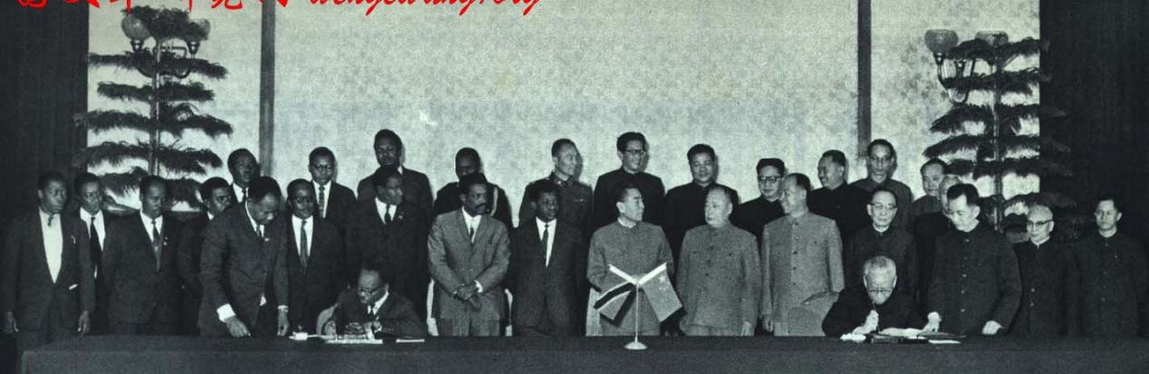 1965年2月,刘少奇与尼雷尔(时任坦桑尼亚总统,桌子上左侧正在写字的人)签署中国-坦桑尼亚协议