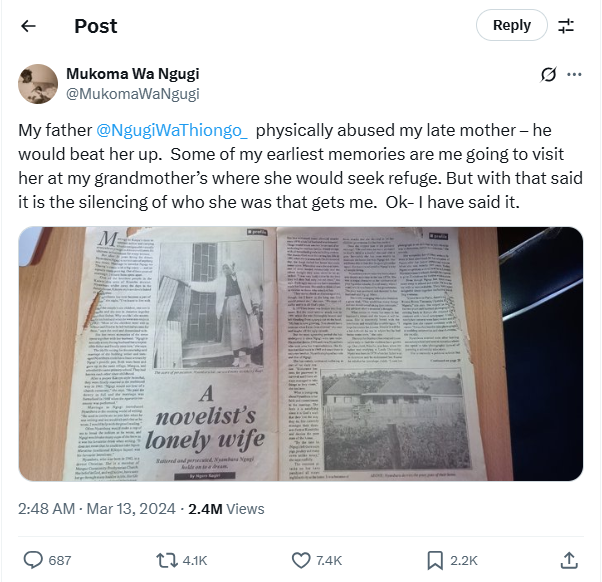 Mukuma(恩古吉的儿子)在X上发布的动态(2024年5月13日),称恩古吉经常虐待(abuse)妻子