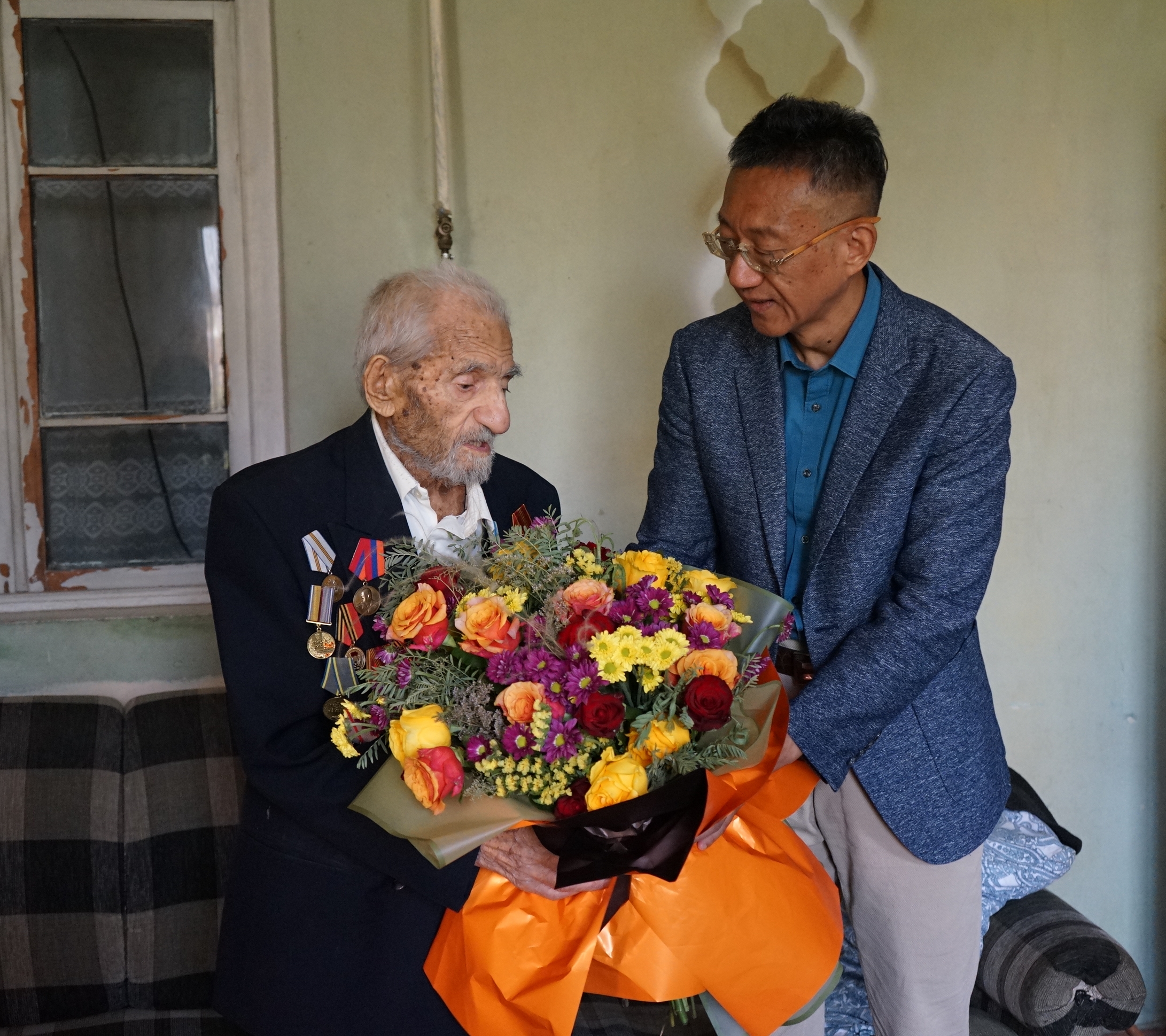 抗战胜利80周年纪念日前夕,驻亚美尼亚大使李鑫炜、使馆国防武官安强分别看望慰问曾赴中国东北参与对日作战的亚美尼亚二战老战士波戈相(103岁)和阿韦季相(104岁)。中国驻亚美尼亚大使馆官网 图