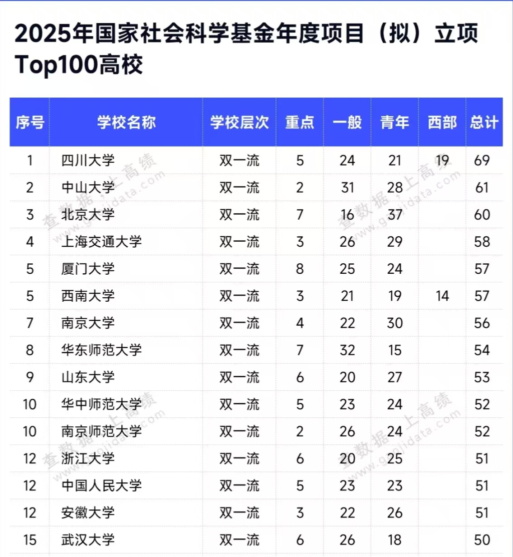 根据软科统计的今年国家社科基金年度项目(拟)立项高校数量排名,安大排在了第12位,仅次于人大,高于武大。对于一所省属大学来说,这是一个值得点赞的成绩。