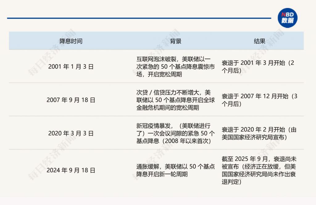 美联储 50 个基点降息与历次衰退时间表
