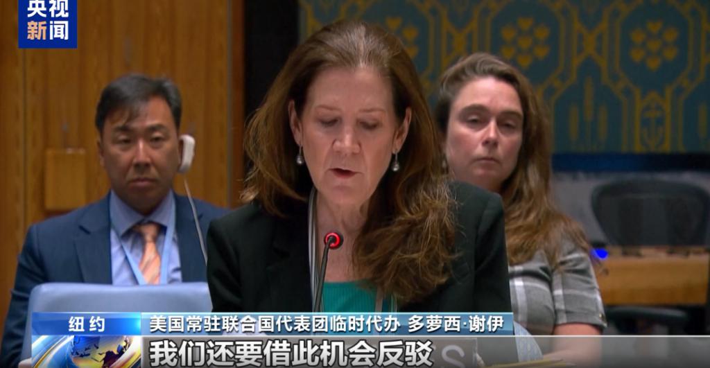 美国常驻联合国代表团临时代办多萝西 · 谢伊公然为以色列辩护称,加沙地带的人道主义灾难不是以色列的责任。图源:央视新闻