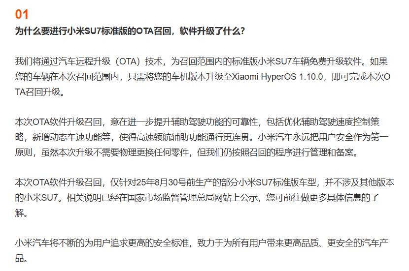 问:为什么要进行小米 SU7 标准版的 OTA 召回,软件升级了什么?
