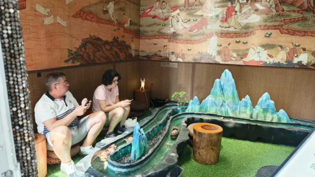 2025年9月12日,M50创意园,外国游客正在茶艺馆体验《兰亭集序》中的“曲水流觞”。