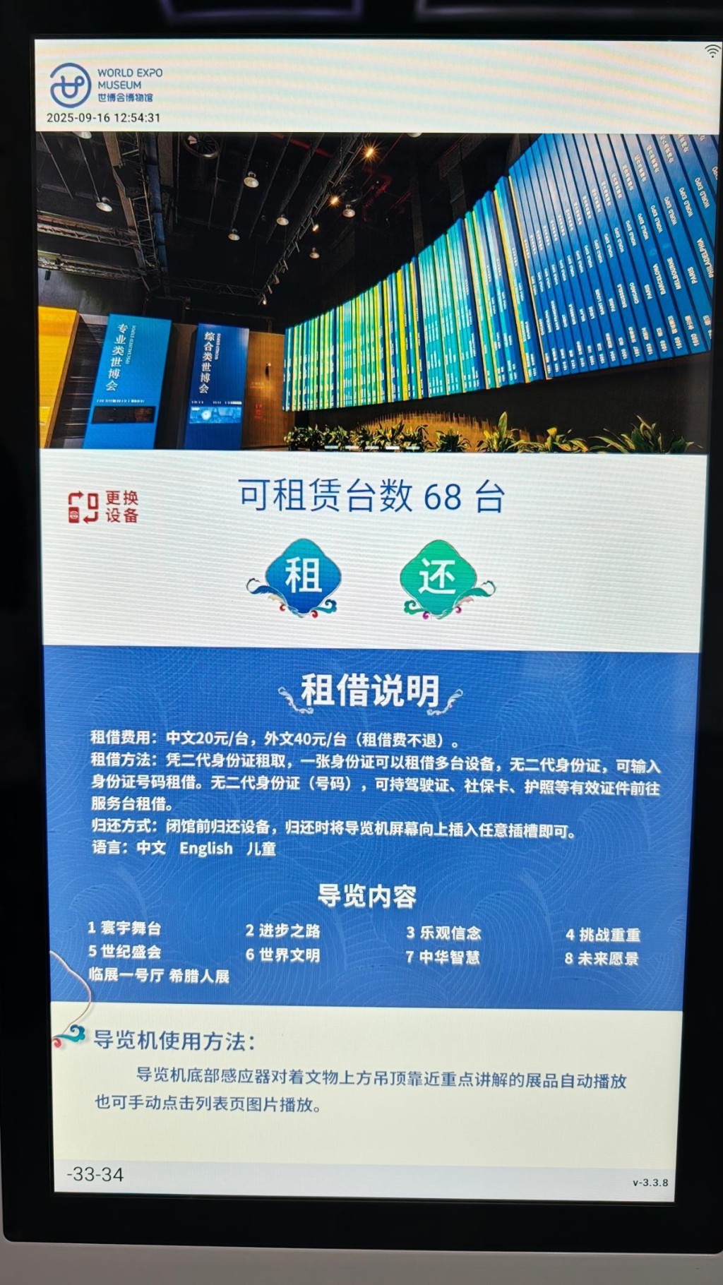 2025年9月16日上午,世博会博物馆,自助语音导览租还界面,租借费用中文20元/台,外文40元/台。