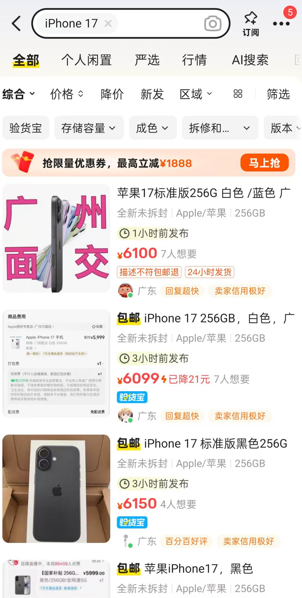 不过,在二手平台,时代财经发现仍有不少 iPhone17 标准版的转卖帖,加价在几十到 150 元,部分黄牛则在国补优惠 500 元后,在 5499 元的基础上加价售卖。