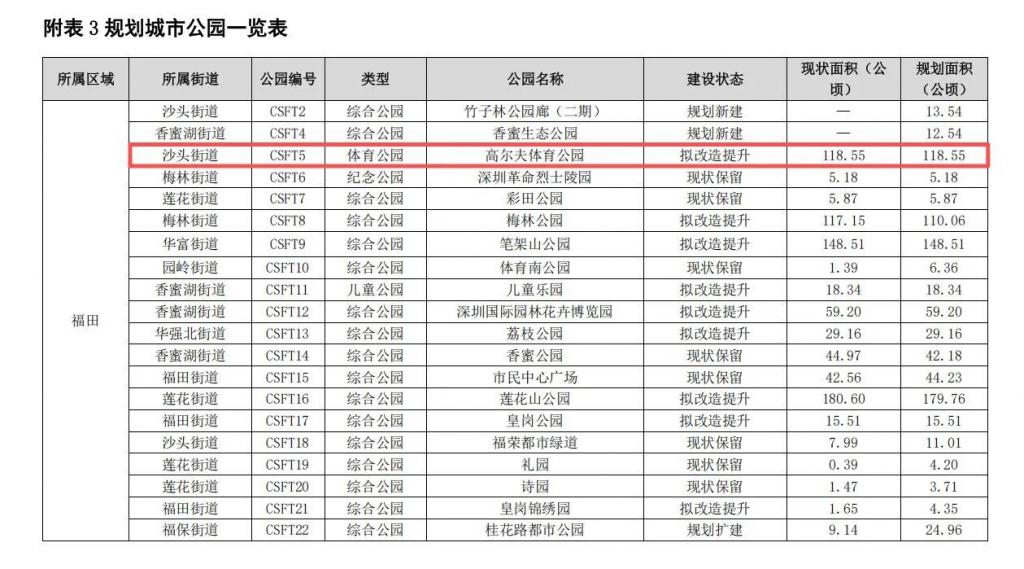 《每日经济新闻》记者注意到,2023 年印发的《深圳市公园建设发展专项规划(2021 — 2035 年)》显示,福田区沙头街道规划 118.55 公顷的高尔夫体育公园,这一面积与深圳高尔夫俱乐部大致相符,彼时建设状态为拟改造提升。另据 2025 年印发的《深圳市国土空间总体规划(2021 — 2035 年)》,深圳高尔夫俱乐部所在地被标为战略预留区。