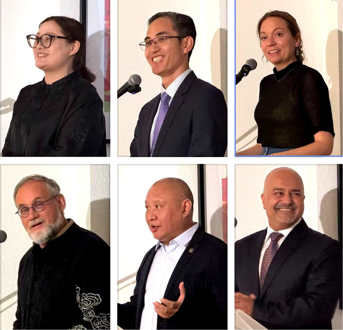 (上)上海市对外文化交流协会代表杨艳、中国驻汉堡代总领事金松宝、汉堡市议会办公厅国际合作部亚洲事务负责人帕尔瓦蒂·瓦桑塔 (下)前德国驻成都总领事鲁悟刚、艺术家代表李磊、帕斯敏艺术联盟主席诺瓦·努里