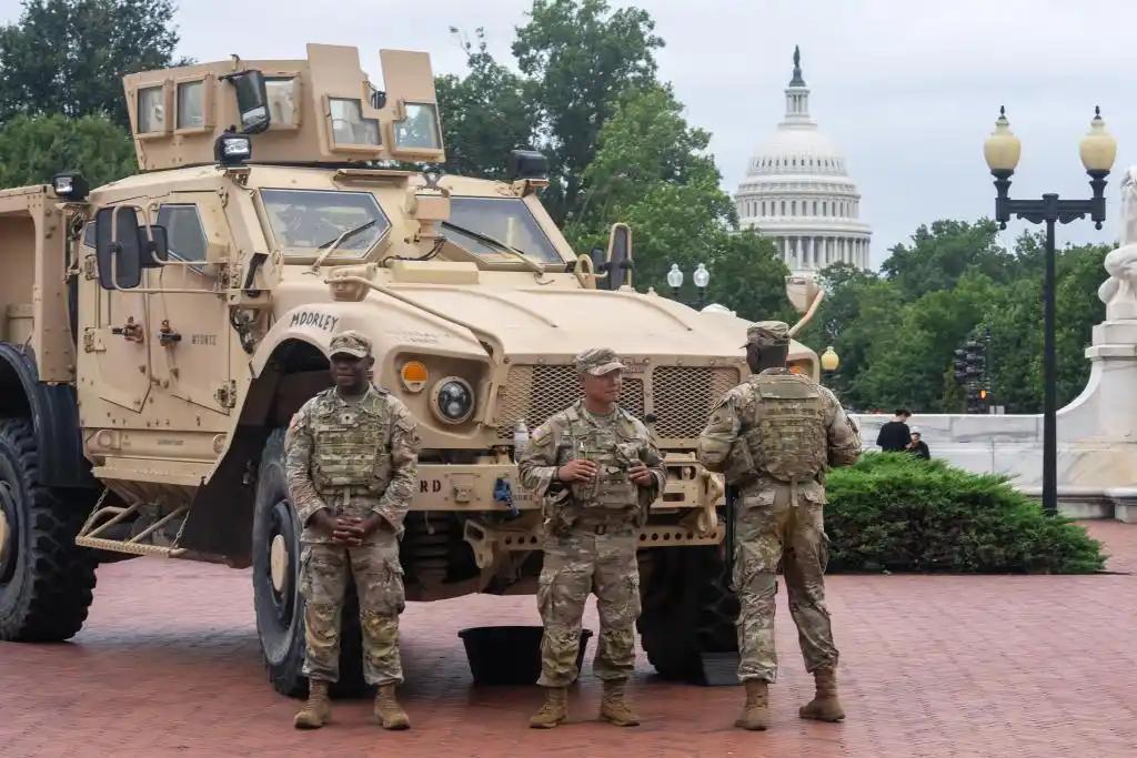 8 月 11 日,美国总统特朗普表示,他正在部署国民警卫队,以协助首都华盛顿特区恢复法律秩序和公共安全。图为华盛顿联合车站外的国民警卫队成员和车辆。