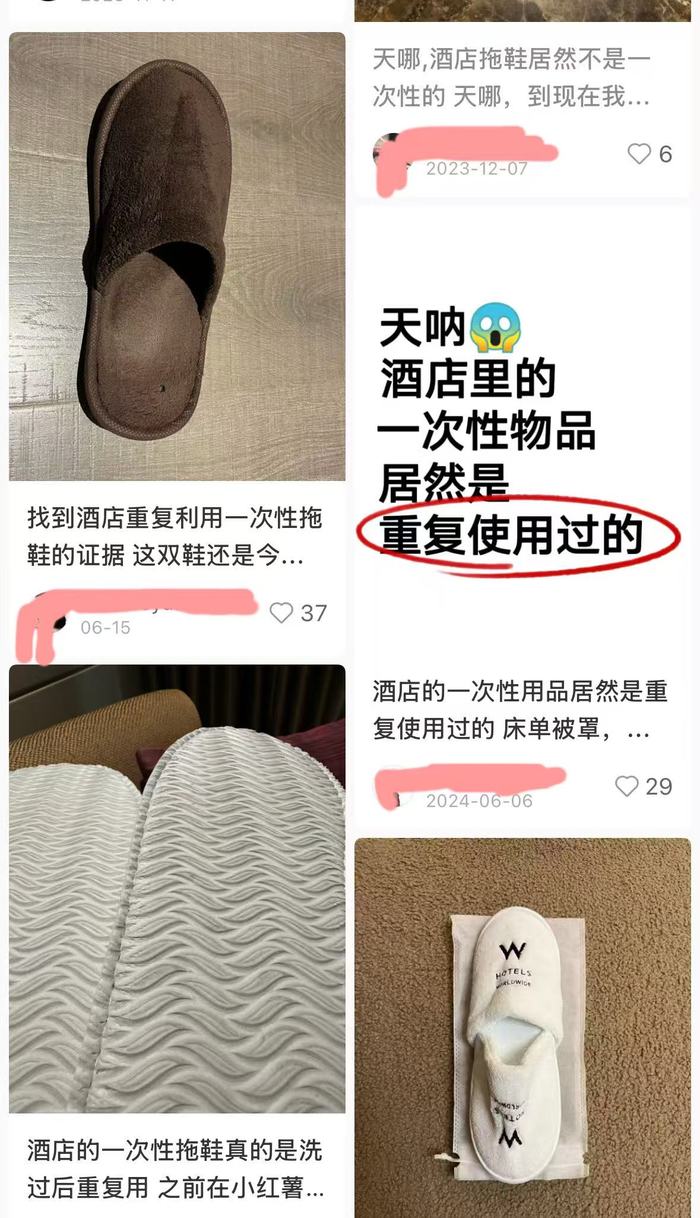 界面新闻记者搜索社交平台发现,关于五星酒店重复使用拖鞋的帖子不在少数。