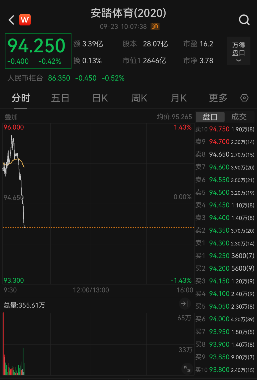 9月23日,安踏体育早盘股价短线拉升后再回落,截至发稿前,报94.25港元/股,跌幅0.42%。