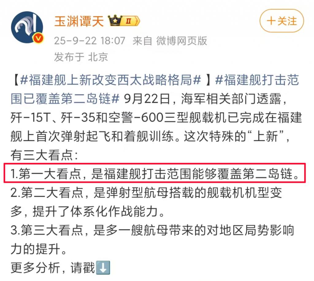 第三,这次官方宣称的 " 福建舰航母打击范围覆盖第二岛链 "。