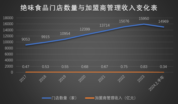 作为四大卤味企业中门店规模最大、历史扩张速度最快的品牌,加盟模式下企业的收入确认本应遵循严格准则。但界面新闻记者发现,绝味食品在门店数量加速扩张的同时,却存在加盟商管理收入异常下滑的现象。