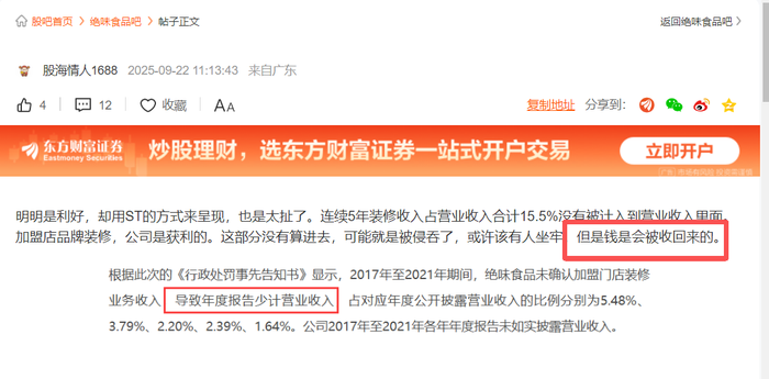 界面新闻记者注意到,线上交流平台上,多位投资者提及,上述监管处罚落地后,绝味食品被少计的超7亿元营收会否被收回上市公司,对公司运营产生积极影响。