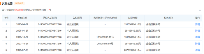 界面新闻记者注意到,上海聚成及上述三家公司2023年均同步出现欠税情况且数额不小。截至2025年4月,绝味食品控股股东上海聚成欠税金山税务局企业所得税金额达1.91亿元,上海慧功、上海成广、上海福博欠税分别达0.34亿元、0.99亿元、2.08亿元。