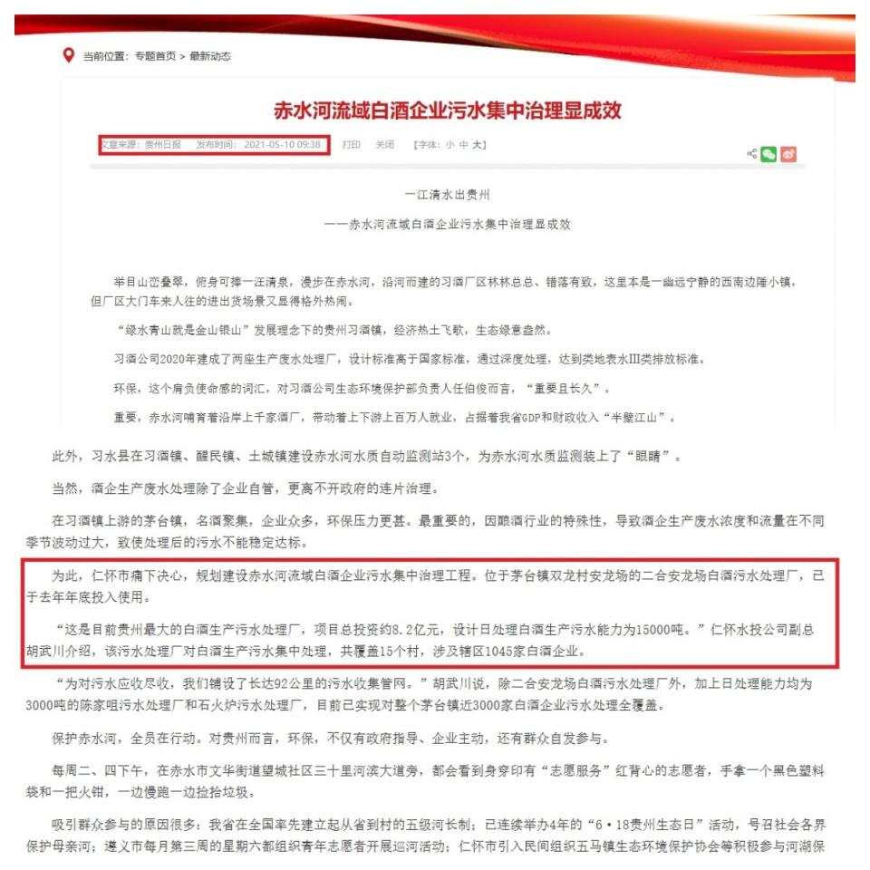 不论是贵州省还是仁怀市当地政府,都对这座位于茅台镇的废水处理厂项目给予高度重视,据央媒和贵州当地媒体报道:" 安龙场白酒废水处理厂是贵州省十大污染源治理工程、贵州省最大的白酒生产废水处理厂,项目总投资约 8.2 亿元,设计日处理白酒生产污水能力 1.5 万吨。覆盖茅台镇 15 个村、涉及 1045 家白酒企业,基本可以解决周边所有酱香酒企业的污水处理问题。"