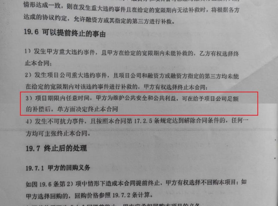 记者在仁怀市出具的 " 解除合同通知书 " 中看到:" 依据 PPP 合同第 19.6 条第 3 项约定,解除 PPP 合同,通知送达之日起生效。" 查阅合同,该项约定内容为:" 项目期限内任意时间,甲方为维护公共安全和公共利益,可在给予项目公司足额补偿后,单方面决定终止本合同。"