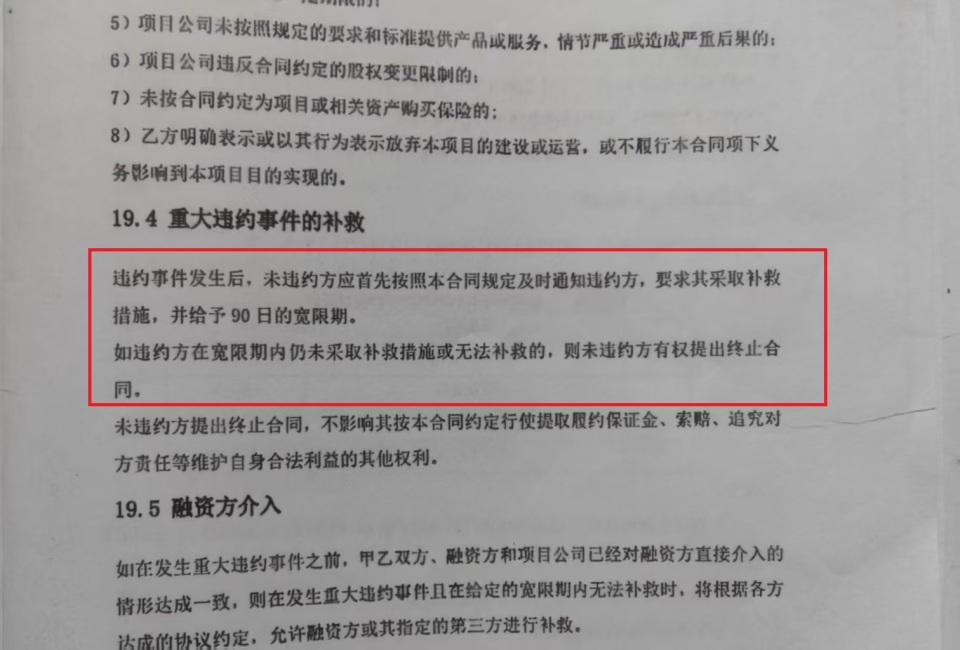 唐显策表示,解除合同通知书中说发现公司存在重大违约行为,但合同中对此有明确约定,发生违约行为后,未违约方应首先通知违约方,采取补救措施,并给予 90 日宽限期,仍未补救或无法补救,则未违约方有权提出终止合同。
