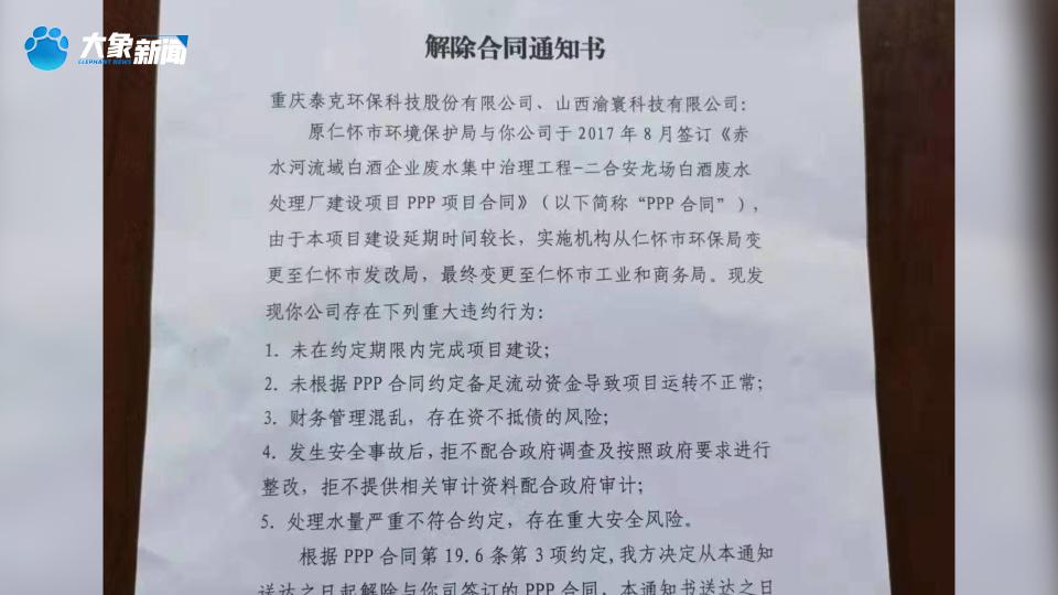 " 这就是我们在茅台镇投资 8 亿建成的白酒废水处理厂,当时仁怀市工业和商务局,就仅仅凭这张解除合同通知书,把我们的人全部撵走,强行接管。" 指着山脚下的厂区,唐显策激动地说:" 这和明抢有什么区别?"