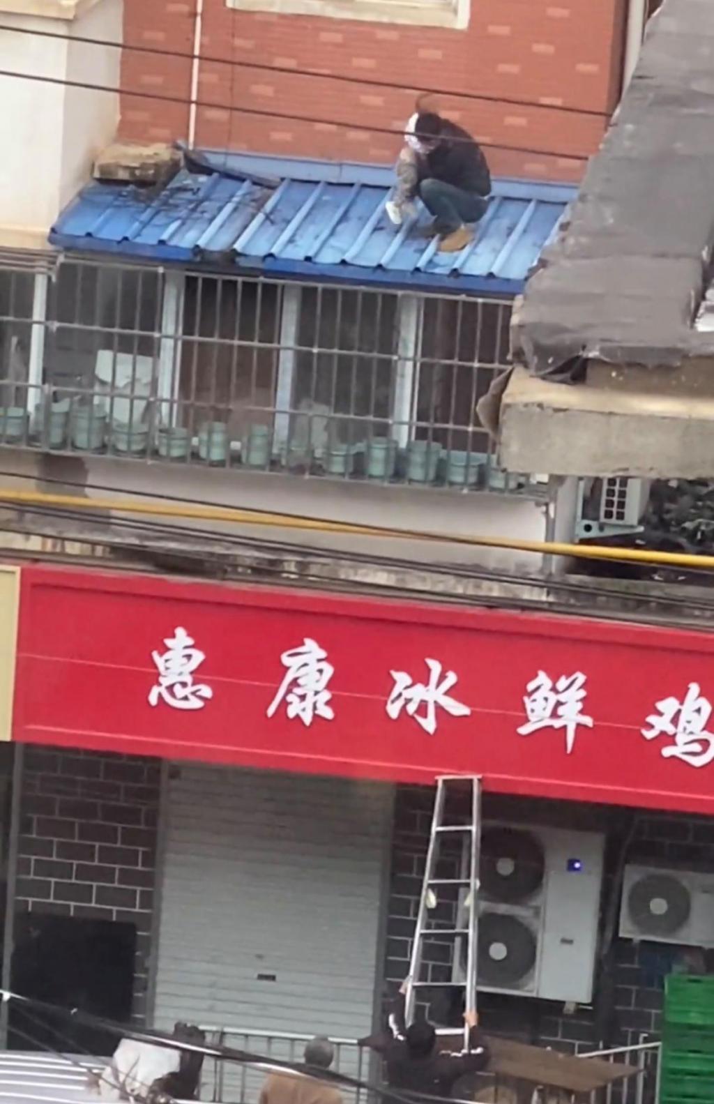 视频时长 2 分 27 秒,开头一名幼童蹲在遮雨棚上,随时有掉落的危险,下方有两个人拿来东西撑开,以防孩子坠落时可以接住。