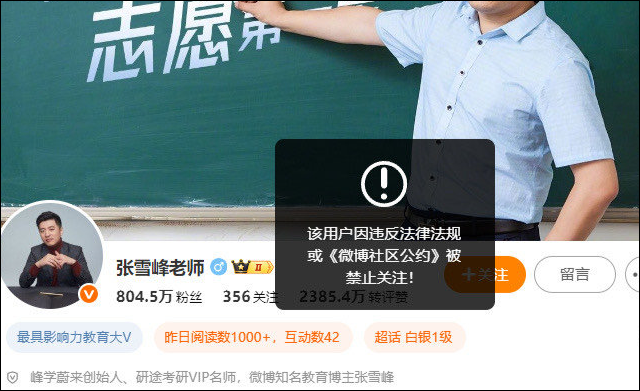 首页 > 综合 媒体:张雪峰多个平台账号被禁止关注 9月24日,经搜索发现,@张雪峰老师 账号在微博、小红书、抖音和B站平台均被禁止关注。2016年6月,张雪峰凭借《七分钟解读34所985高校》走红网络。
