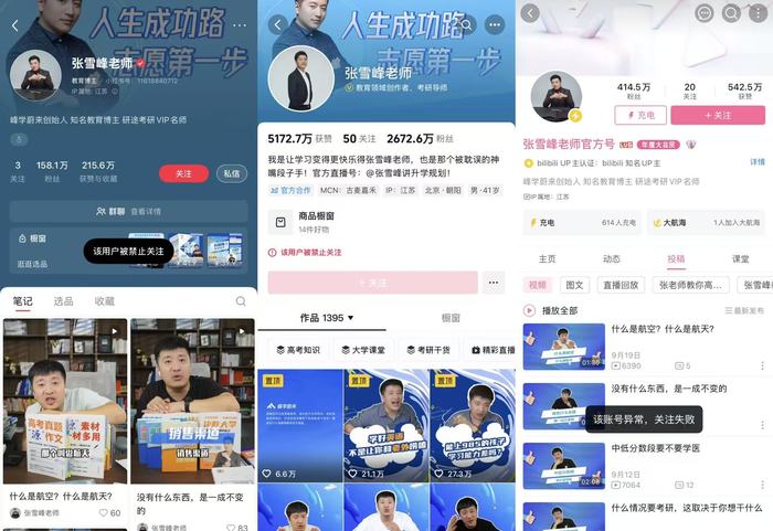 9月24日,教育领域自媒体人张雪峰在抖音、快手、微博、小红书、B站等多个平台账号被禁止关注。据正在新闻报道,其在抖音平台上如“张雪峰讲升学规划”、“张雪峰聊考研”、“张雪峰说考研”等账号目前依然可以关注,且多个账号正在直播。