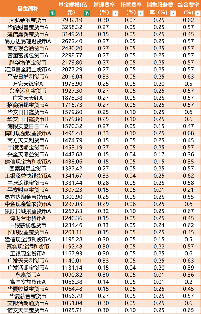 界面新闻梳理数据发现,在规模超过千亿的货币基金中,降费前的天弘余额宝综合收费居于前列,相对较高。