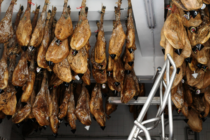 让这一猪种声名远播的,当然是jamón ibérico——伊比利亚火腿。含着丝丝缕缕半透明油脂的深红色火腿薄片,口感浓郁又细腻绵密,甜美的脂肪带着坚果和森林香气流动在肉质中。萨拉曼卡省的这片风水宝地,海拔千米,干燥冷冽,正是伊比利亚火腿的三大原产地之一,是享誉世界的火腿厂牌费尔明(Fermín)与小何塞(Joselito)的故乡。